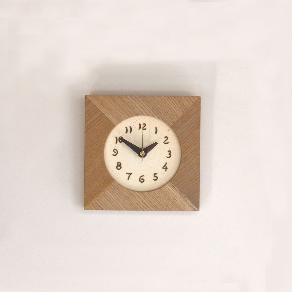 文字盤は陶で作りました。白い化粧土をかけた粘土板に、掻き落としの技法で数字を書き、炭化の窯で焼いたもので、漆喰のような質感です。