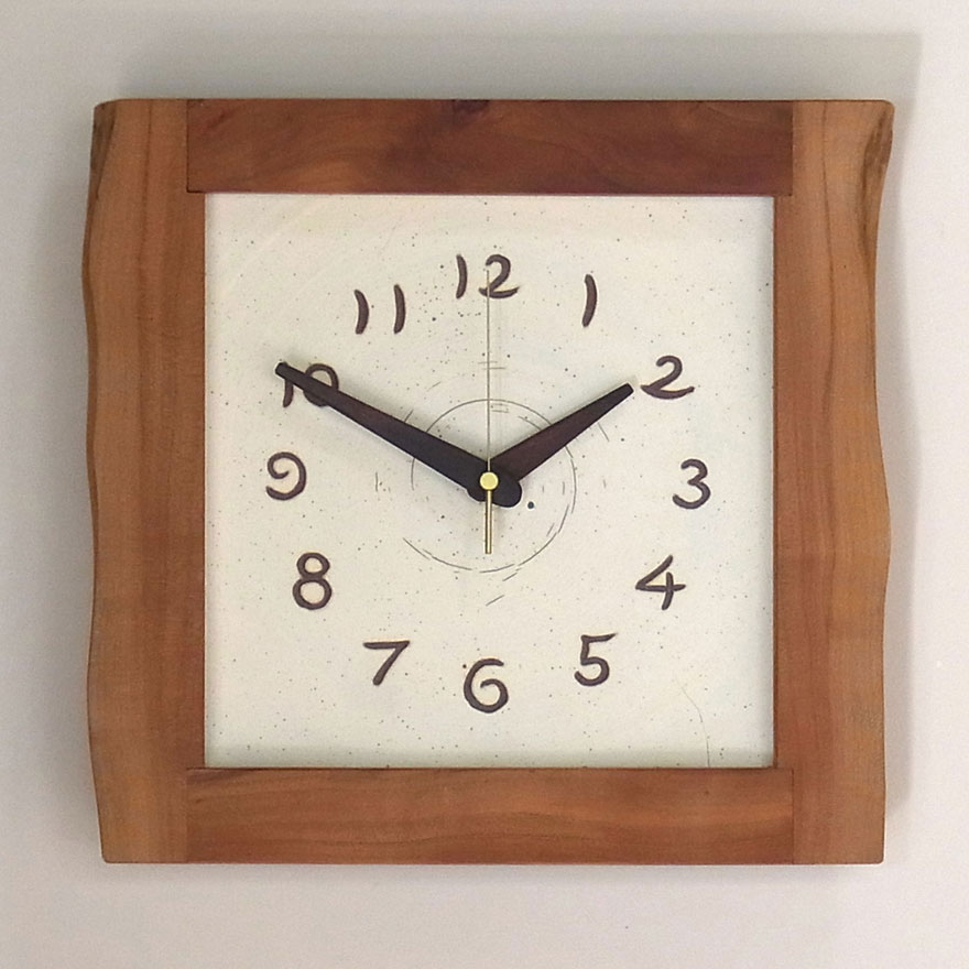 フレームは木の自然な形を生かして作りました。陶の文字盤は白い化粧土をかけた粘土板に、掻き落としの技法で数字を書き炭化の窯で焼いたものです。漆喰のような質感です。
